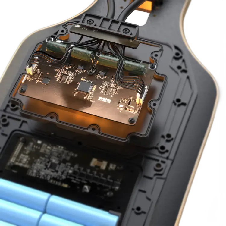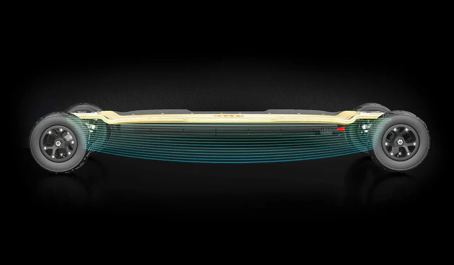 We’ve teamed up with one of the world’s leading skate deck manufacturers to create a deck constructed from layered bamboo and fibreglass to put you in the goldilocks zone for flex. The segmented battery enclosure allows you to harness the full flex of the bamboo without any risks to the electrics.